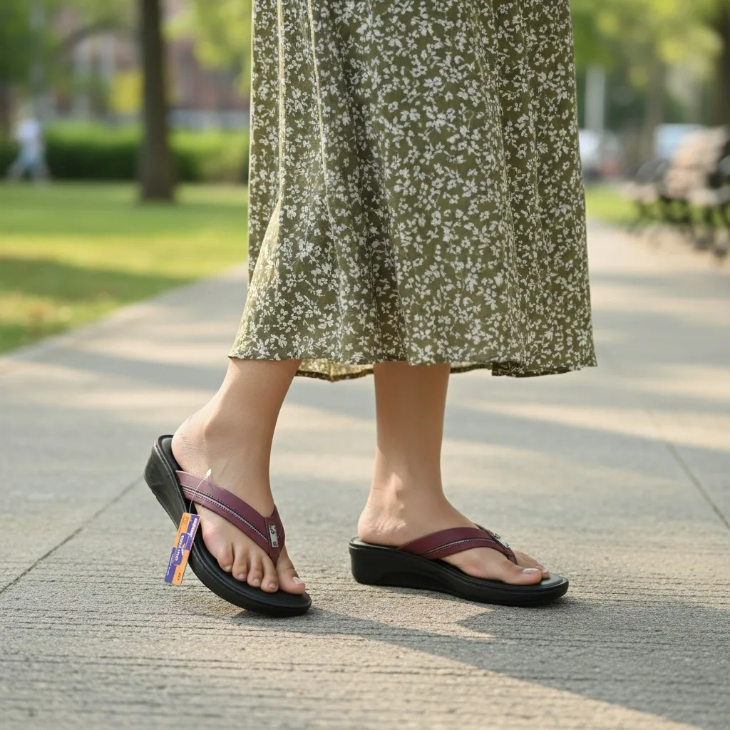 These wedge-style flip-flops are designed for the modern woman who refuses to sacrifice comfort for style. Featuring a deep maroon/burgundy strap with elegant metallic detailing, these sandals transition perfectly from a casual day at the park to a relaxed evening out. The “Soft Feel” technology and cushioned footbed provide all-day support, while the slight wedge heel offers a gentle lift that complements everything from floral dresses to everyday denim. ✨