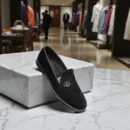 Elegant black velvet loafers featuring a signature metallic “GG” monogram on the front. These versatile shoes seamlessly combine luxury aesthetics with casual comfort, perfect for adding a hint of sophistication to everyday and smart-casual outfits.