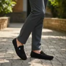 These stylish black suede loafers feature a subtle, comfortable moccasin silhouette with a small round metal badge detail on the upper, reminiscent of automotive-inspired fashion. Their clean and minimal design is versatile for smart-casual ensembles and relaxed everyday wear.