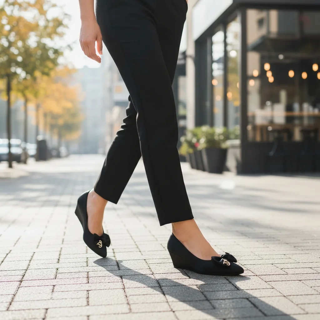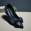 These chic black wedge pumps feature a pointed toe and a soft satinβlike finish, topped with a stylish bow and a subtle metallic emblem for a refined, feminine touch. Designed for dayβlong comfort, they blend dressy elegance with easy walkability, perfect for work, outings, or dinners.
