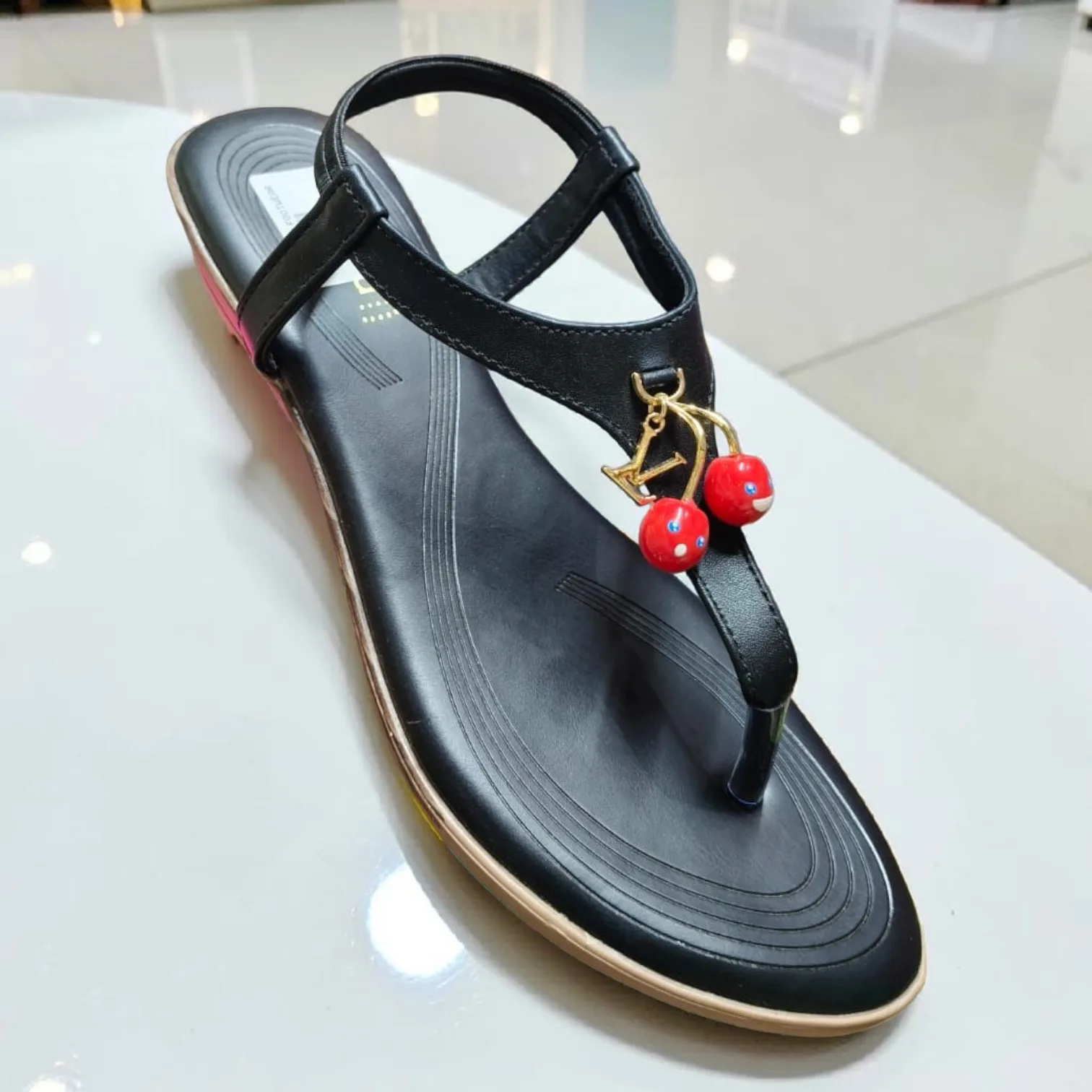 These stylish black T-strap sandals blend minimalist design with a playful, high-fashion twist. Featuring a sleek matte finish and a comfortable flat sole, the standout feature is the vibrant cherry charm dangling from a gold-toned logo accent. Whether you’re heading to a brunch or a casual evening out, these sandals offer a perfect mix of sophistication and whimsical charm. β¨