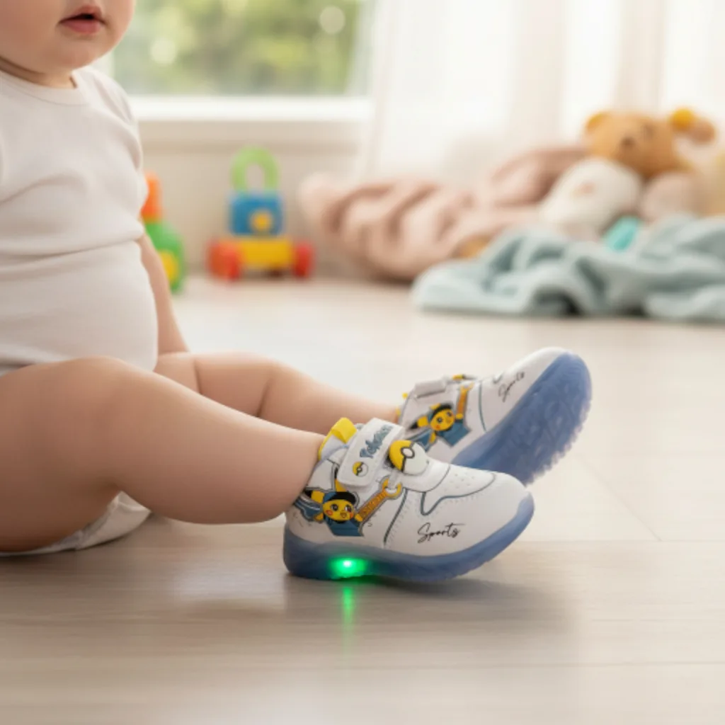 Playful white sneakers for toddlers featuring bright yellow-and-blue cartoon characters, a comfy padded collar, and semi‑transparent light‑up soles that flash green with every step.