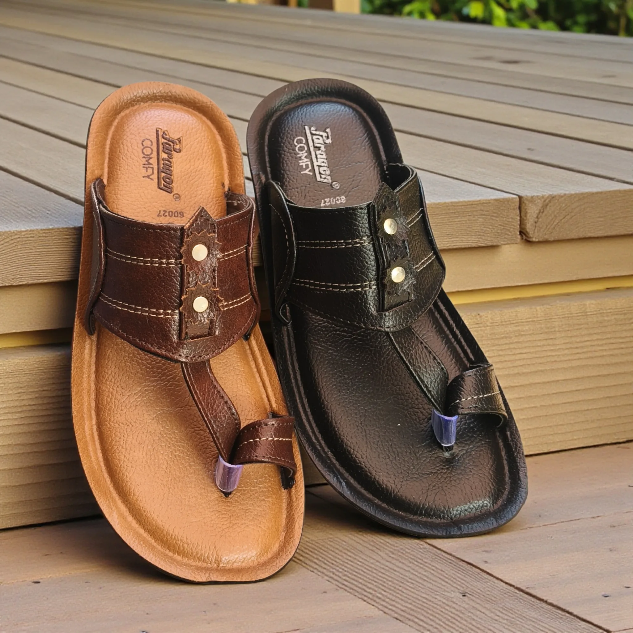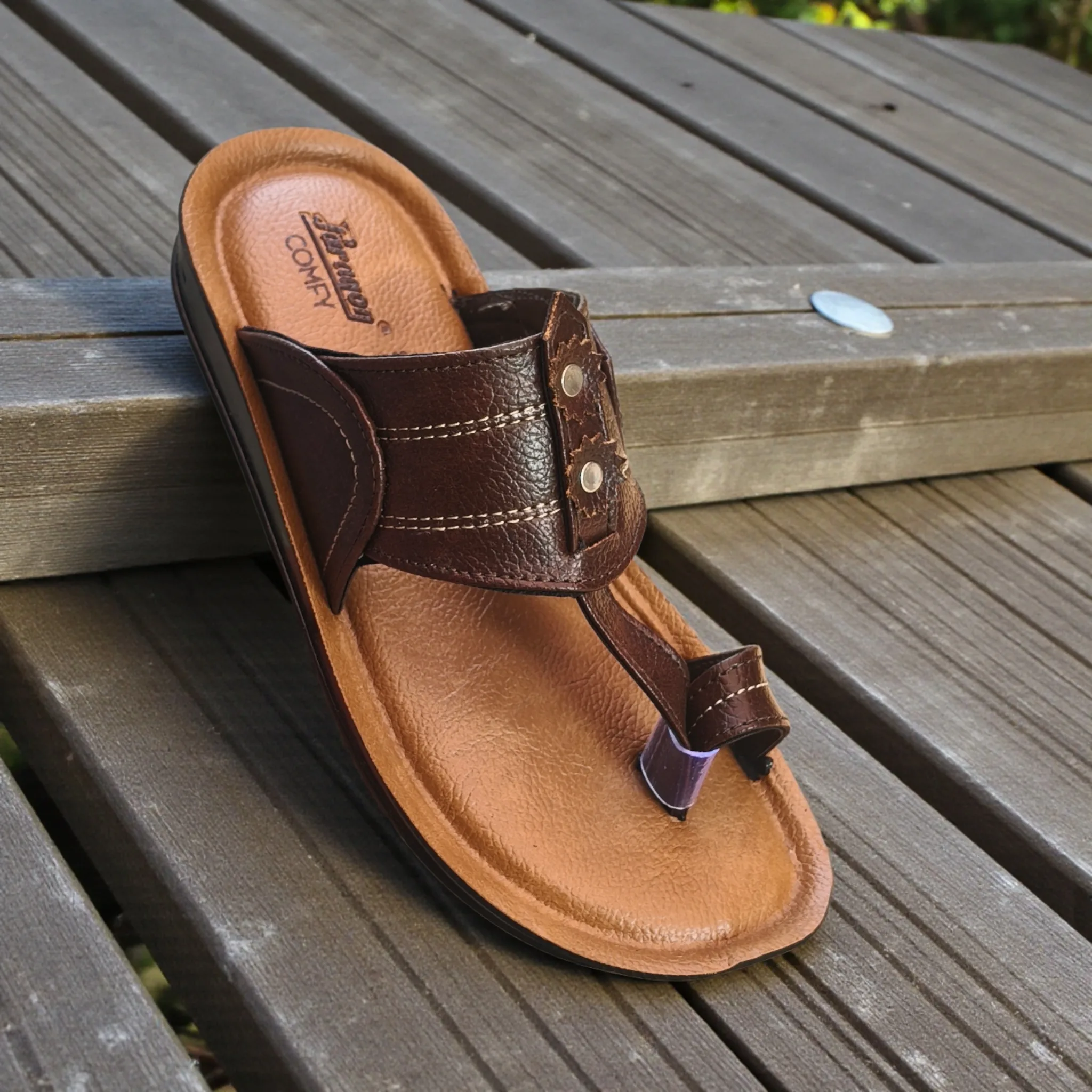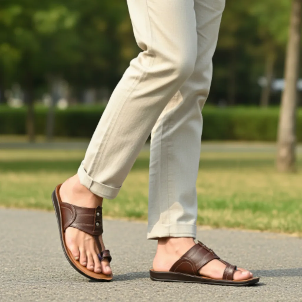 Men’s open-toe slip-on sandals with a toe-ring front and broad midfoot strap, designed for everyday comfort with a rich leather-look finish in brown and black. The molded footbed and low-profile sole keep each step cushioned yet stable, making them ideal for walks in the park or casual outings.