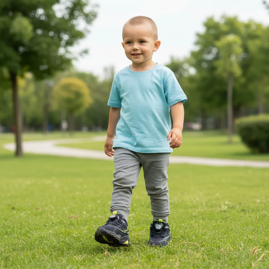 Textured outsole for strong traction on grass, pathways, and playgrounds.