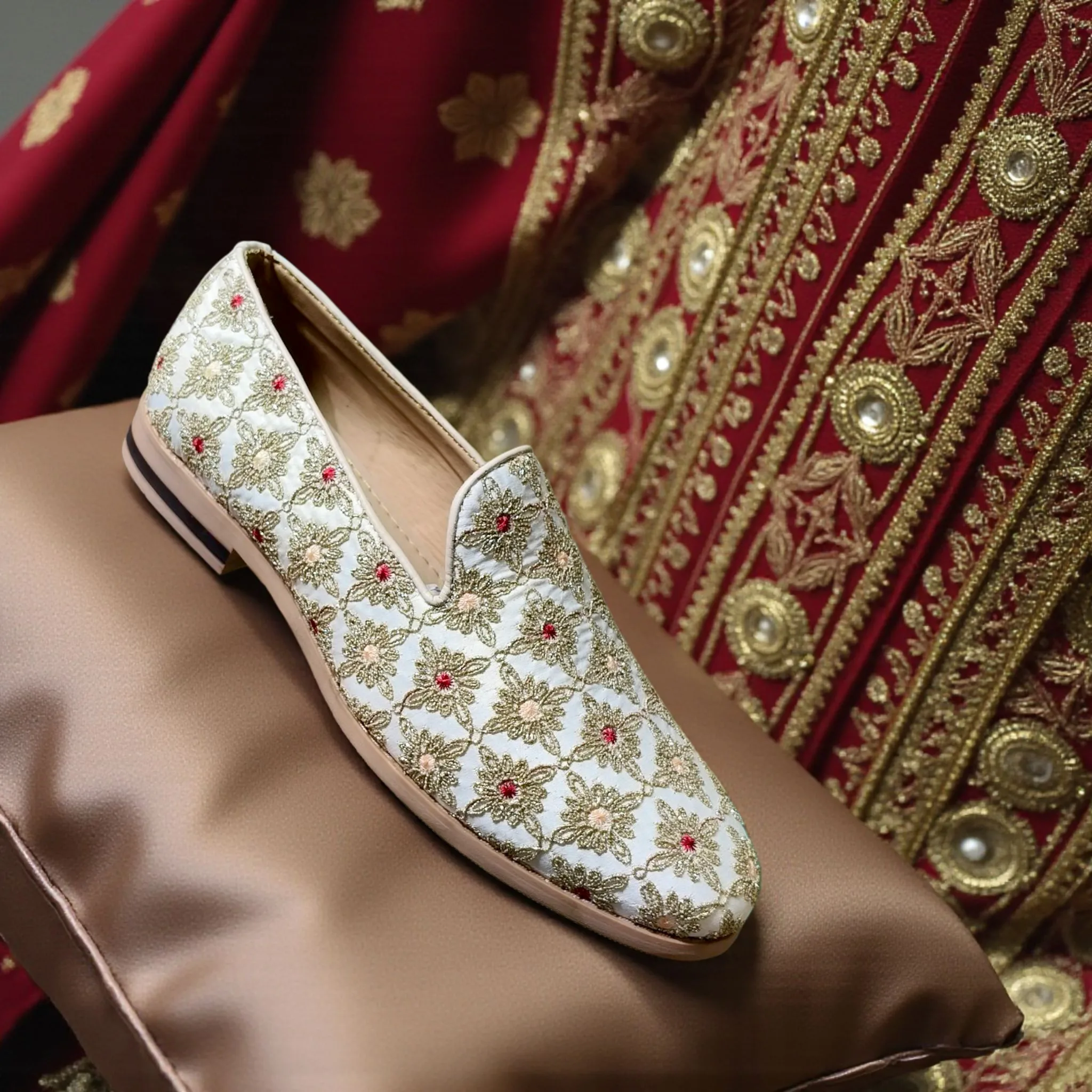 Step into royalty with these exquisitely embroidered mojaris, perfectly paired with an elegant sherwani for grand celebrations. Crafted for the modern prince, each pair reflects timeless tradition and luxurious comfort.