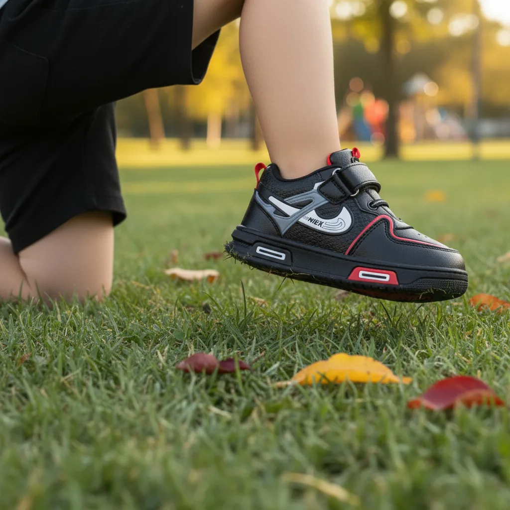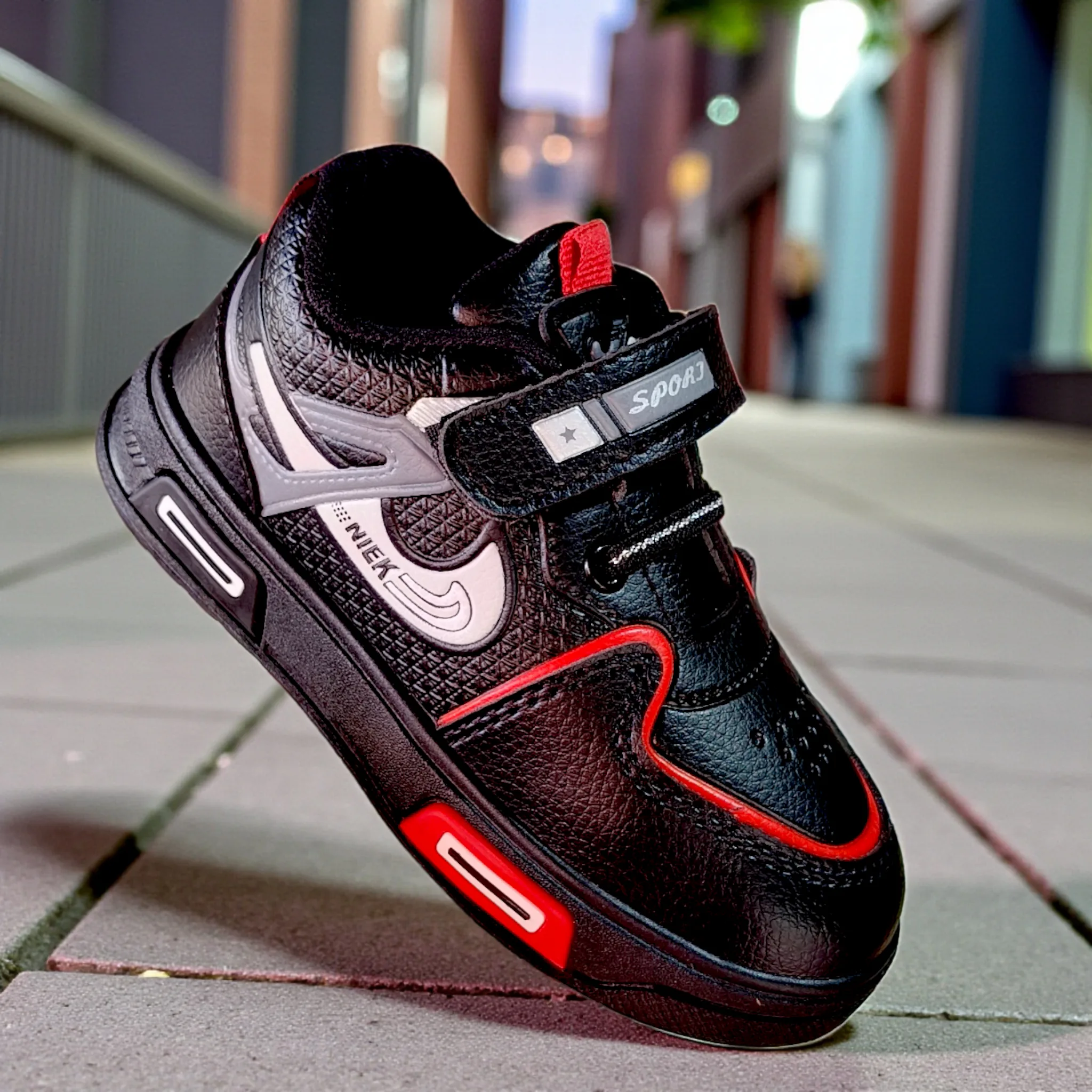 Tough, sporty sneakers for kids designed for active play, featuring a black base with bold red highlights and silver speed‑stripe detailing. The sturdy upper, cushioned ankle, and grippy outsole keep growing feet supported on grass, pavements, and playgrounds from morning to evening.