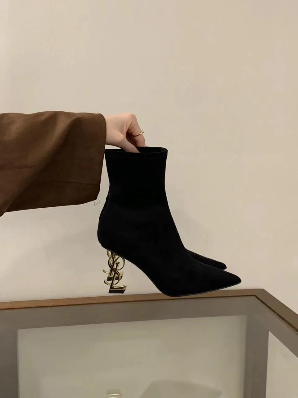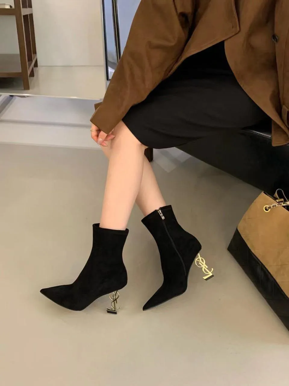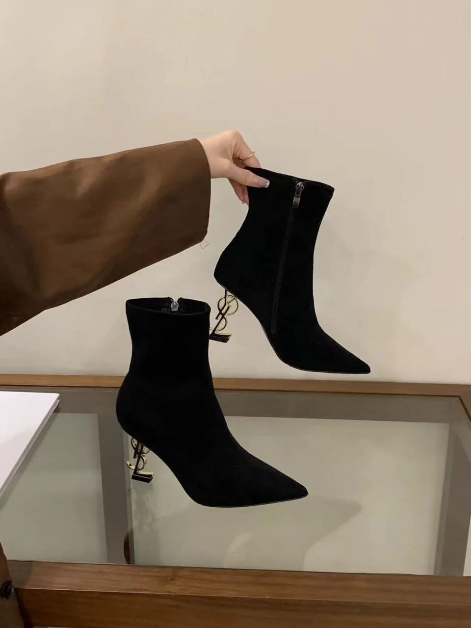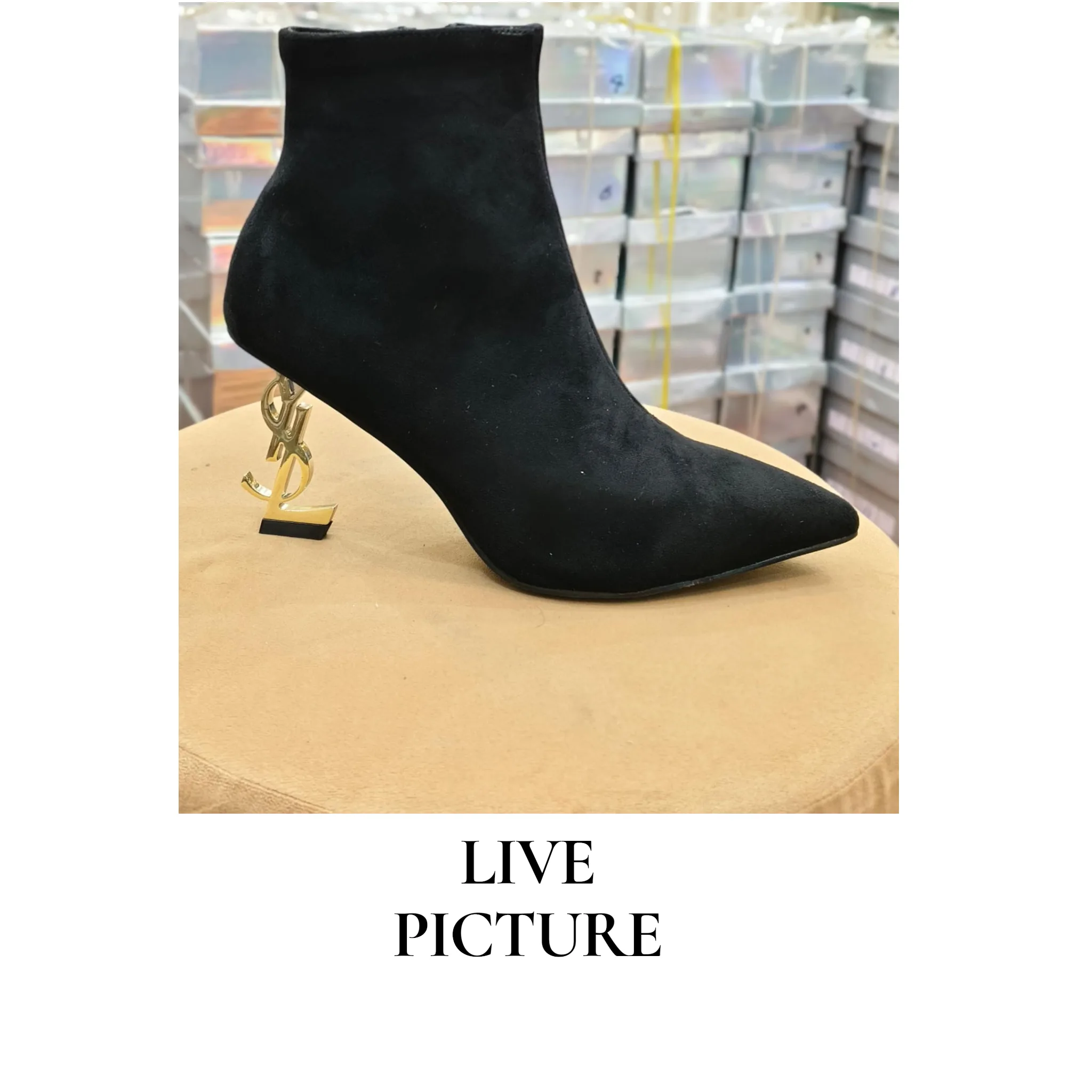 Velvet Icon Heel Boots are sleek black ankle‑high ladies’ boots in soft velvet with a sharp pointed toe and a sculpted metallic monogram heel that looks like wearable jewellery. Designed for modern women, they pair effortlessly with dresses, skirts, and tailored pants for parties, dinners, and special occasions.